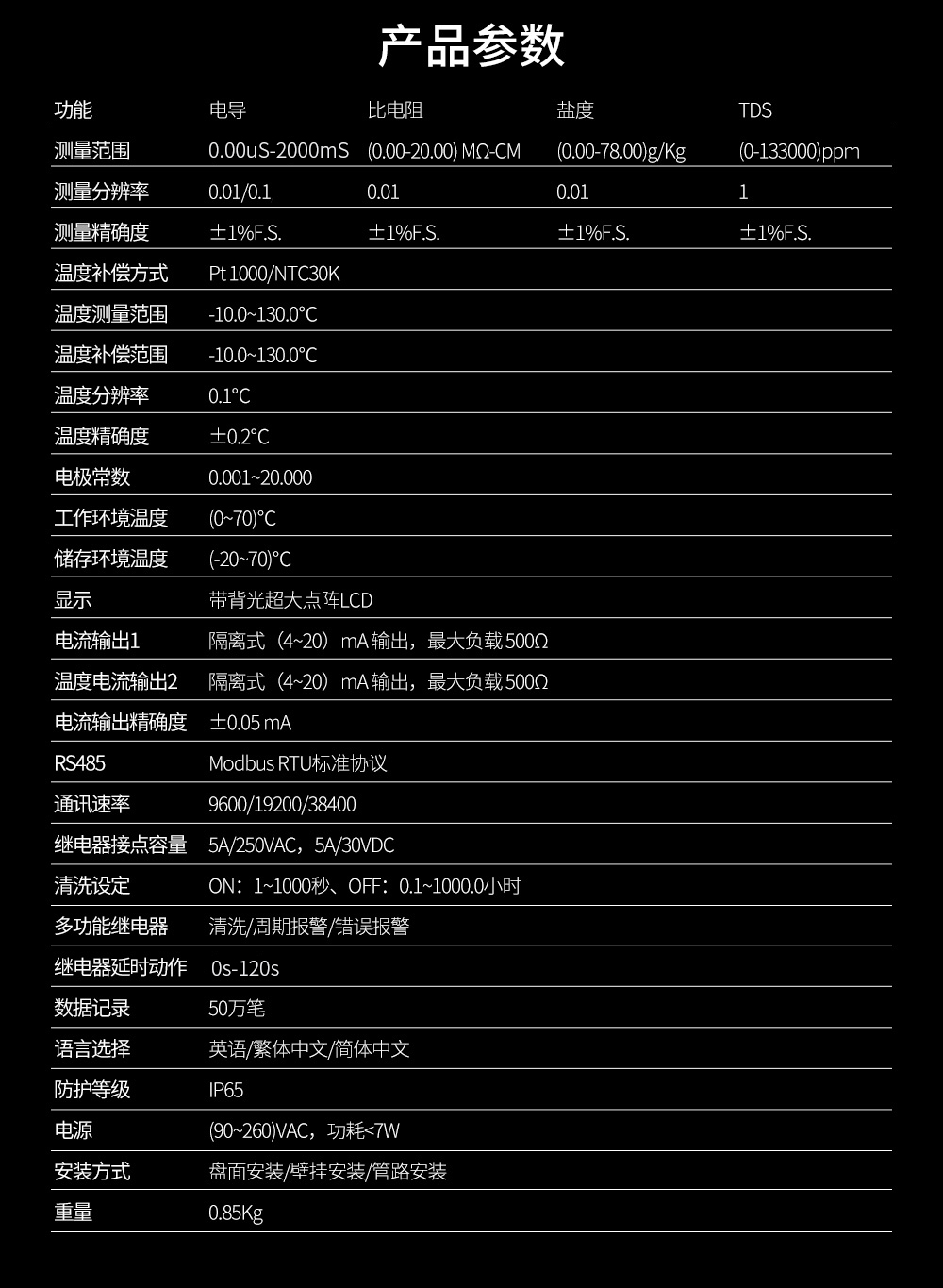 儀器用于工業上電導/比電阻/鹽度/溶解固體總量及溫度的測量,如: 廢水,純凈水,環境監測,食品生產過程等,儀器可以盤面安 裝,壁掛安裝,管路安裝。儀器提供 2 路電流輸出,最大負載為 500Ω, 儀器提供 3 路控制用繼電器,繼電器最大承受電壓及電流為 5A/250VAC 或 5A/30VDC。 CN3