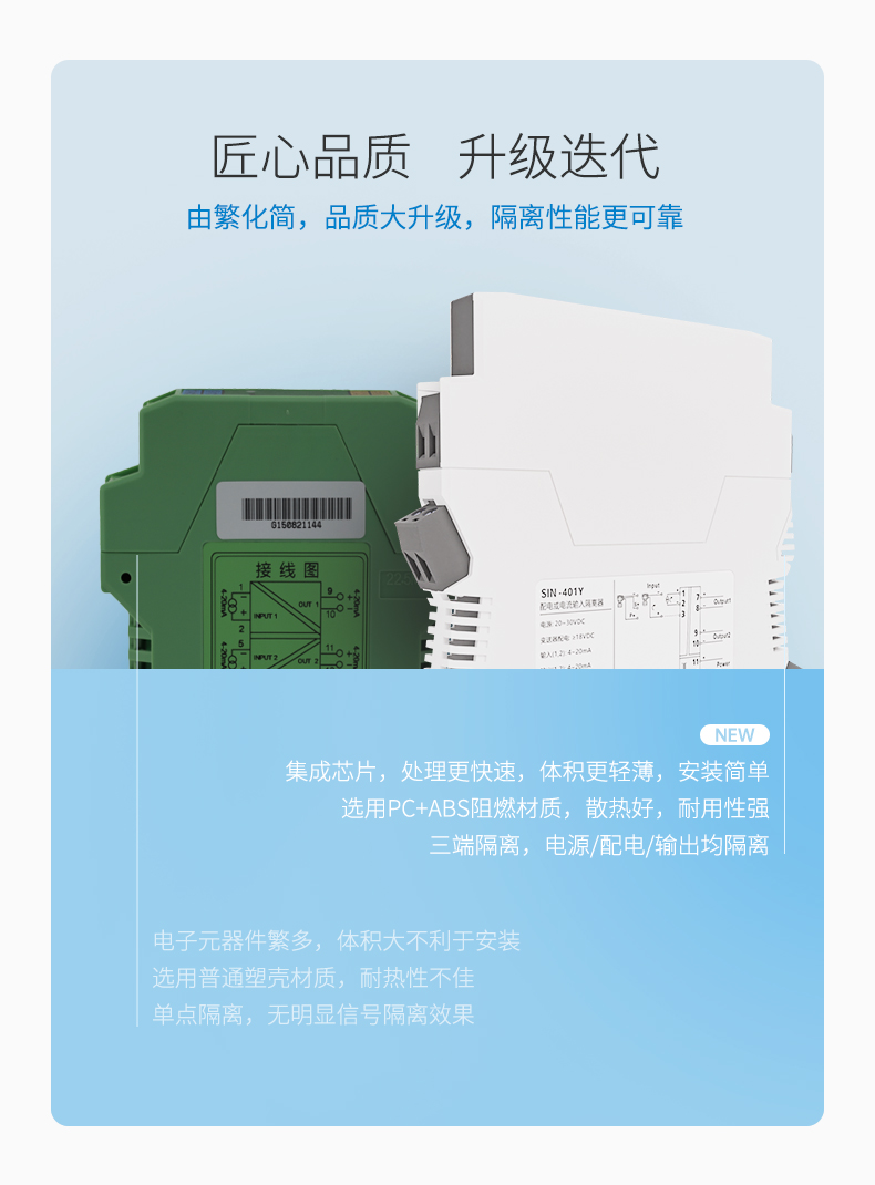 信號隔離器是一種信號隔離裝置,將輸入單路或雙路電流或電壓信號,變送輸出隔離的單路或雙路線性的電流或電壓信號,并提高輸入、輸出、電源之間的電氣隔離性能。