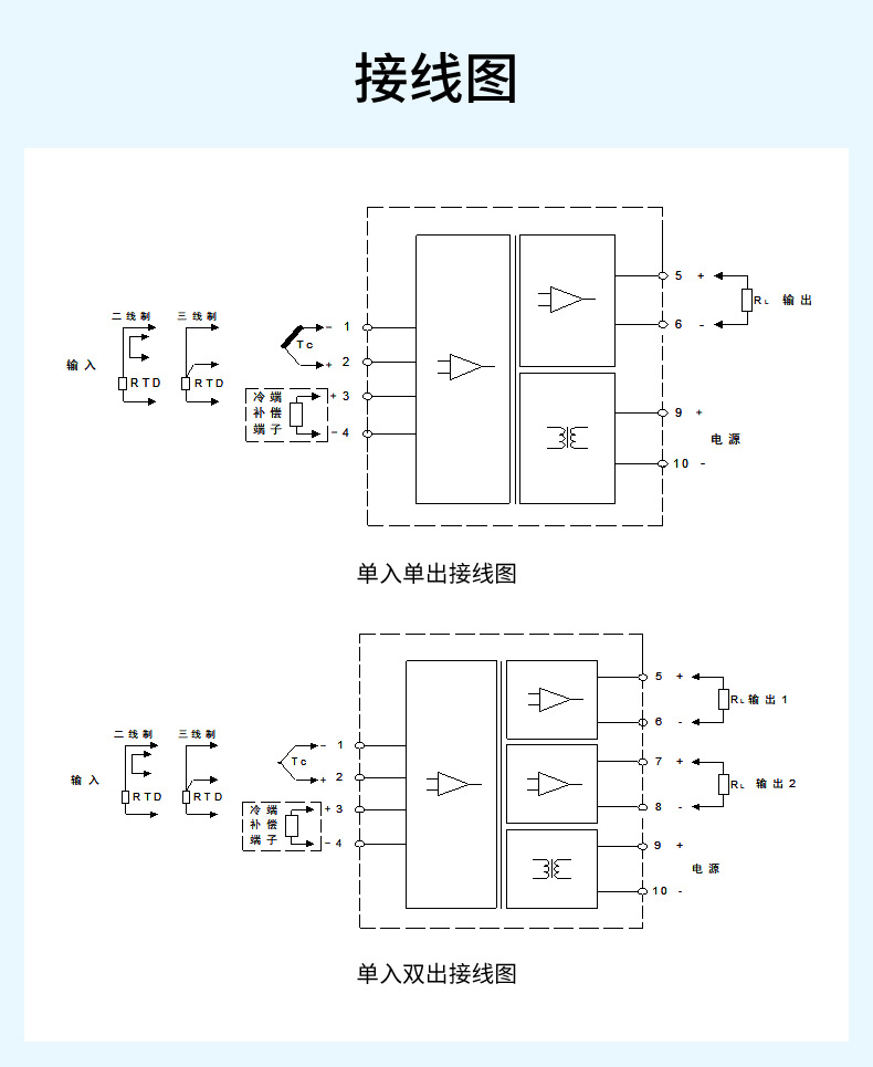 輸入熱電偶/熱電阻信號,經隔離轉換為電流/電壓信號輸出。CN2