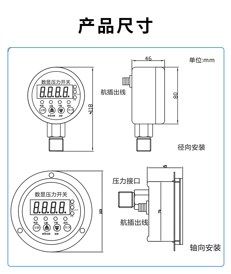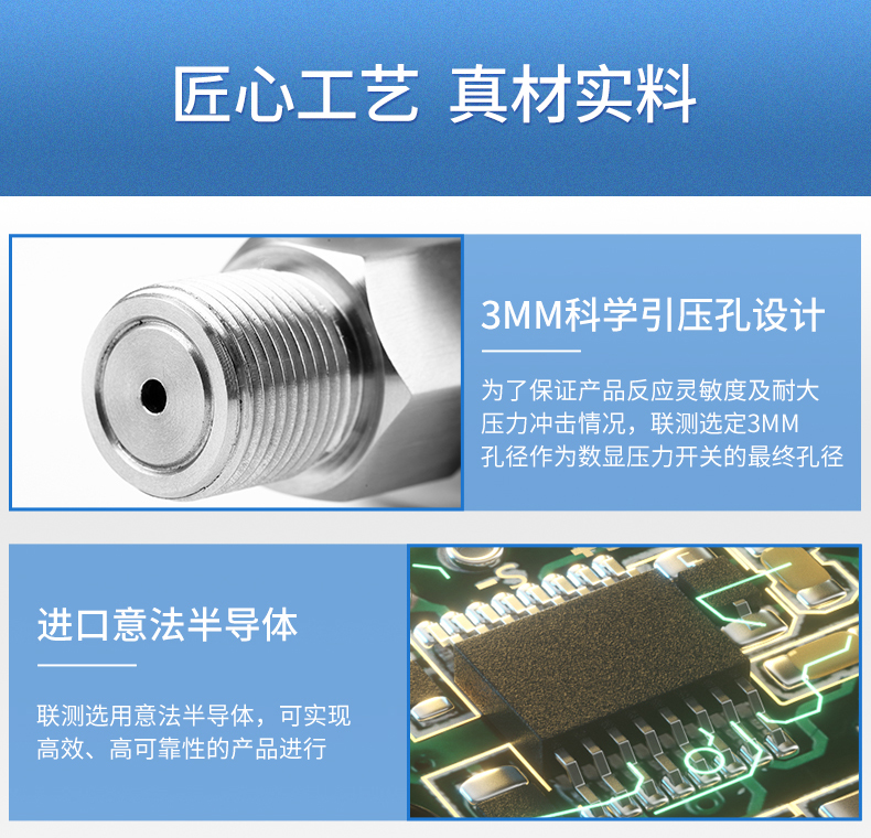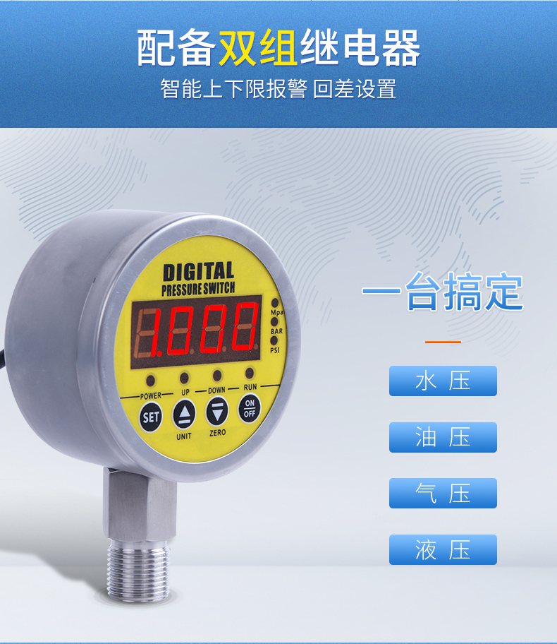 數顯壓力開關設計為控制油壓、氣壓、水壓的兩路獨立的壓力監控。并輔以報警方式選擇、密碼保護,延時報警、誤差清零、采樣速率可調等功能,使該產品更準確更智能的實現壓力報警和控制。